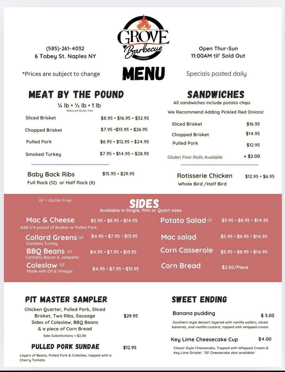 As a reviewer savoring the offerings at Grove Barbecue Company, the menu reads like a celebration of classic barbecue with prices that reflect generous portions and quality. On the meat‑by‑the‑pound roster, standouts include Texas Style Brisket - $32.95, Brisket (Chopped) - $26.95, Turkey Breast - $28.95, Pulled Pork - $24.95 and Baby Back Ribs (Full $29.95 / Half $15.95), along with savory smoked sausage options and Rotisserie Chicken (Whole $14.95 / Half $7.95). The sandwich lineup pairs these smoked favorites with kaiser rolls, such as Sliced Brisket - $16.95, Chopped Brisket - $14.95, Pulled Pork - $12.95, and Smoked Turkey - $14.95, making for satisfying handhelds. Sides like Potato Salad - from $5.95, BBQ Beans - from $4.95, Collard Greens - from $4.95 and creamy Mac n’ Cheese - from $5.95 add depth to the smoky mains. Specialty treats such as the playful Pulled Pork Sundae - $12.95 and generous Pit Master Sampler - $28.95 cap off the experience, while sweet endings like Banana Pudding - $3.00 and Key Lime Cheesecake Cup - $4.00 offer a light, refreshing finish to a hearty meal.